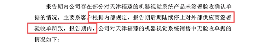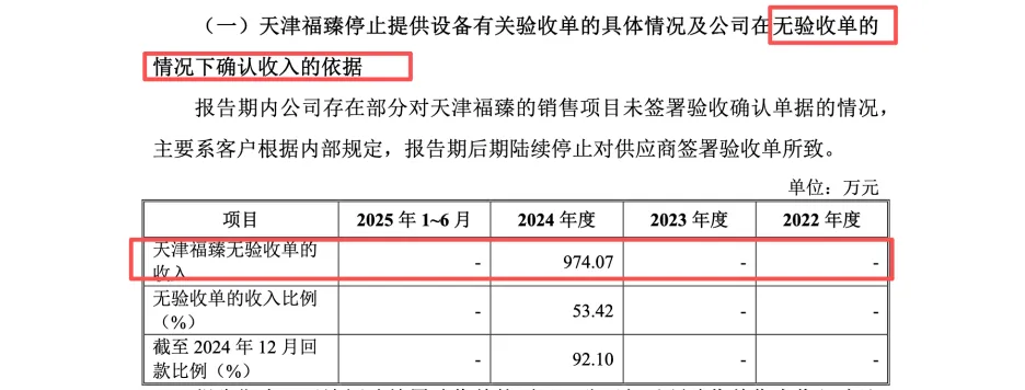 但在实际执行中,此项政策被公然突破。易思维在首轮及二轮问询回复中均承认,2024年度对客户“天津福臻”确认的收入中,存在974.07万元系“无验收单的情况”。