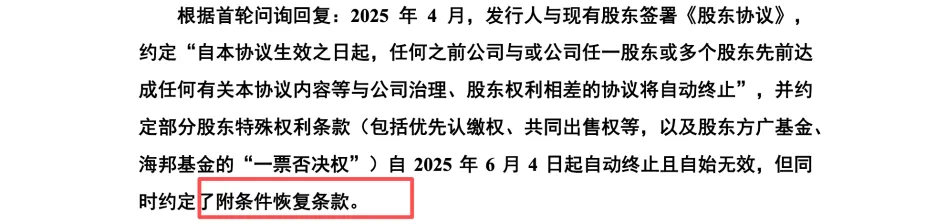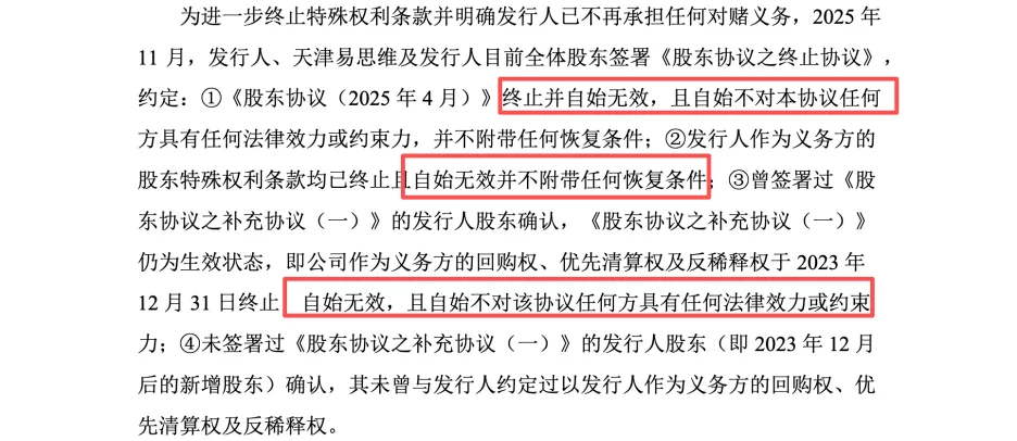 根据二轮问询函披露,易思维于2025年4月(申报前夕)签署了《股东协议》,该协议约定部分股东特殊权利“自2025年6月4日起自动终止且自始无效”,但同时约定了“附条件恢复条款”。