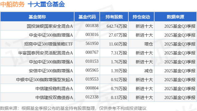根据2025基金Q3季报公募基金重仓股数据,重仓该股的公募基金共9家,其中持有数量最多的公募基金为国投瑞银基金的国投瑞银国家安全混合A。国投瑞银国家安全混合A目前规模为28.57亿元,最新净值1.1525(11月20日),较上一交易日下跌1.57%,近一年上涨5.57%。该公募基金现任基金经理为李轩。