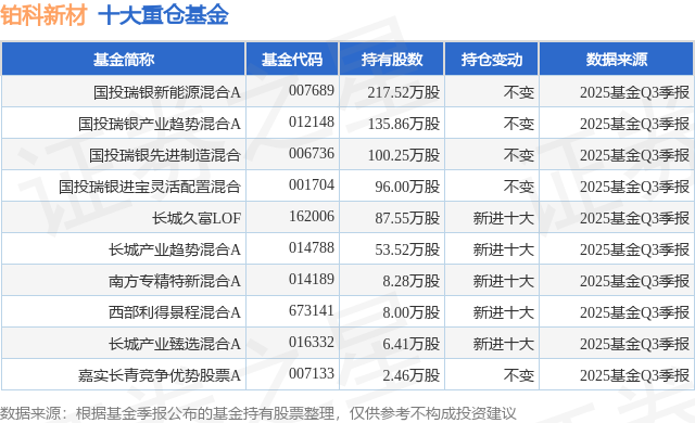 根据2025基金Q3季报公募基金重仓股数据,重仓该股的公募基金共12家,其中持有数量最多的公募基金为国投瑞银基金的国投瑞银新能源混合A。国投瑞银新能源混合A目前规模为21.48亿元,最新净值2.0911(11月26日),较上一交易日上涨1.37%,近一年上涨47.03%。该公募基金现任基金经理为施成。施成在任的基金产品包括:国投瑞银先进制造混合,管理时间为2019年3月29日至今,期间收益率为162.42%;国投瑞银进宝灵活配置混合,管理时间为2020年1月23日至今,期间收益率为78.52%;国投瑞银产业趋势混合A,管理时间为2021年6月9日至今,期间收益率为-11.08%。