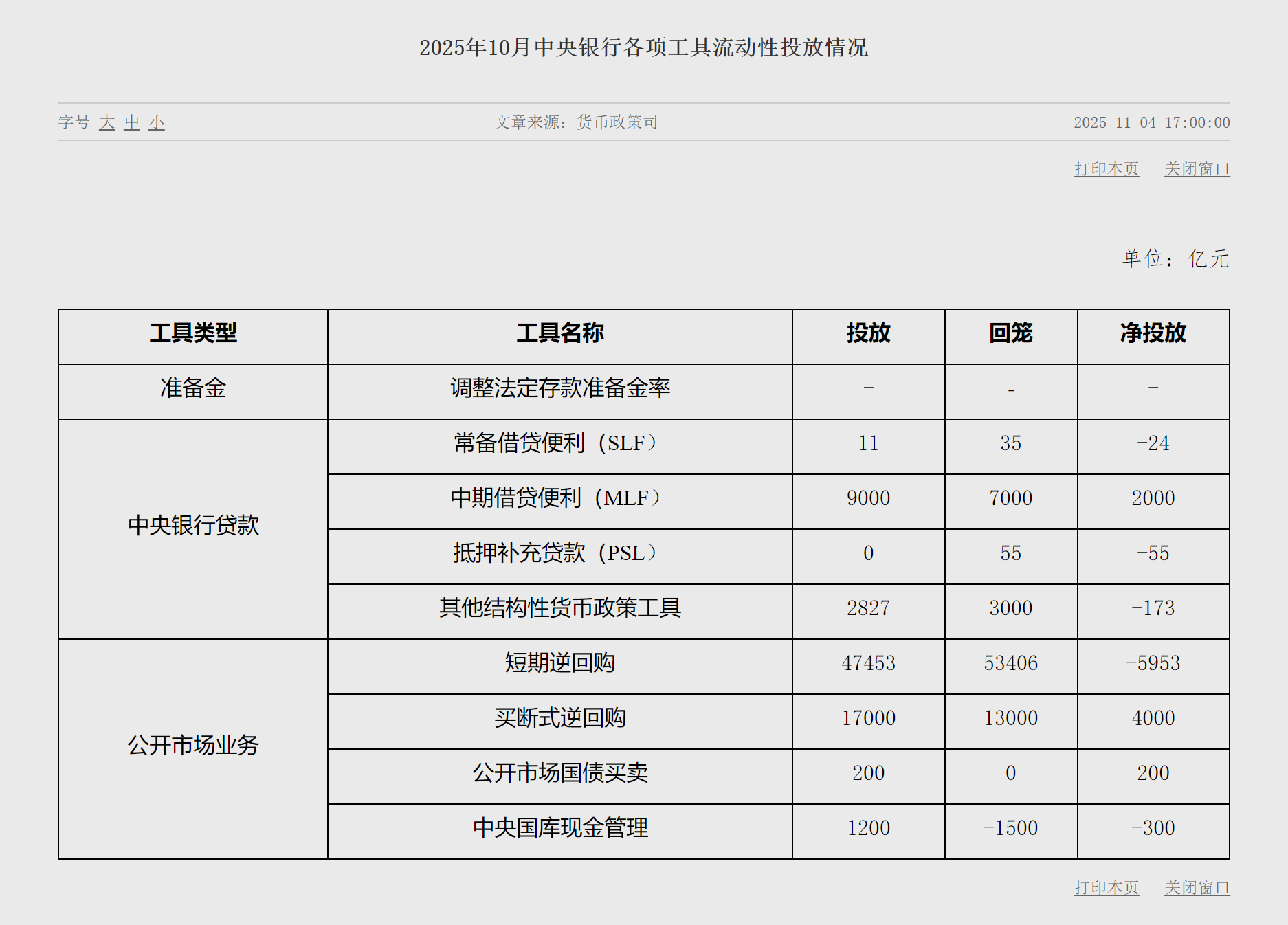 央广网北京11月4日消息(记者 冯方)11月4日,中国人民银行公布2025年10月各项工具流动性投放情况。数据显示,人民银行10月恢复公开市场国债买卖,当月净投放200亿元。此外,人民银行10月通过短期逆回购净回笼5953亿元,通过买断式逆回购净投放4000亿元,通过中期借贷便利(MLF)净投放2000亿元。